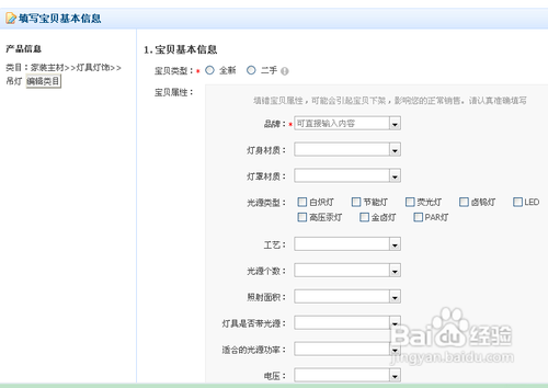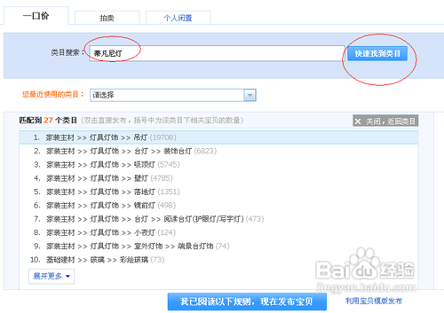 3,这里有类目,我们得选择我们的类目来发布宝贝,不过,你也可以输入你的宝贝名称,系统会自动匹配类目。比如我这里是蒂凡尼灯,输入之后就自动匹配了。