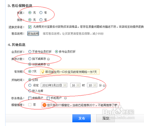 10,有没有发票要填好,不然售后买家找麻烦,有没有保修也说明,然后就是开始时间以及橱窗推荐。最后点击发布就ok了。