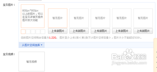 6,上传宝贝图片,这里的图片大小为310*310,这样就可以填充整个图框,然后如果想要有细节的展示,我们可以上传一张800*800以上的图片,系统会自动有放大镜功能。另个,上传的第一张宝贝图片是不算图片空间大小的。
