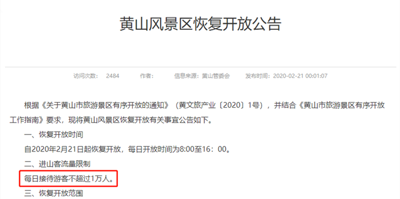 2月21日,黄山风景区管理委员会发布公告,即日起恢复开放。中午12点迎来了首个游客。据悉,游客为福建籍,该游客也创造了历史记录:1人“包场”游黄山。为做好防疫工作,景区每日接待游客不得超过1万人,门票采用网上实名预约和线下扫码非接触式购票,进入景区必须佩戴口罩,量体温,团体购票不得超过30人。、、、