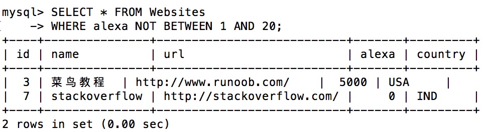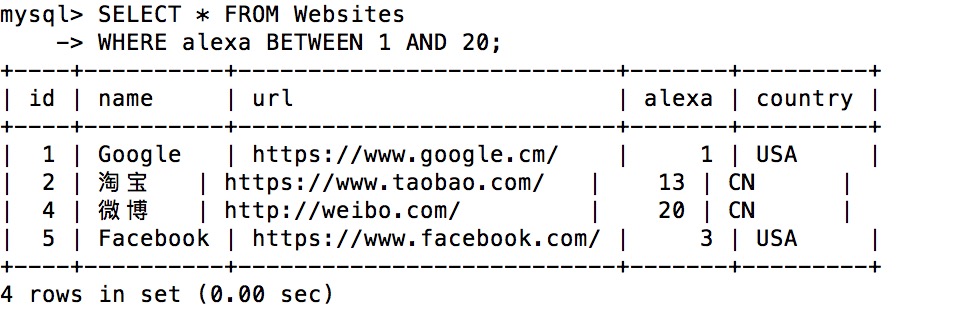 mysql> SELECT * FROM Websites;+----+---------------+---------------------------+-------+---------+| id | name | url | alexa | country |+----+---------------+---------------------------+-------+---------+| 1 | Google | https://www.google.cm/ | 1 | USA || 2 | 淘宝 | https://www.taobao.com/ | 13 | CN || 3 | 菜鸟教程 | http://www.runoob.com/ | 5000 | USA || 4 | 微博 | http://weibo.com/ | 20 | CN || 5 | Facebook | https://www.facebook.com/ | 3 | USA || 7 | stackoverflow | http://stackoverflow.com/ | 0 | IND |+----+---------------+---------------------------+-------+---------+