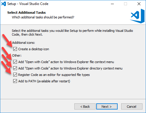 VSCode 安装也很简单,打开官网 https://code.visualstudio.com/,下载软件包,一步步安装即可,安装过程注意安装路径设置、环境变量默认自动添加到系统中,勾选以下所有选项:
