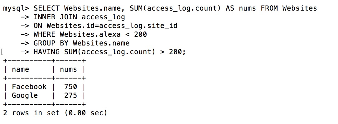 SELECT Websites.name, SUM(access_log.count) AS nums FROM WebsitesINNER JOIN access_logON Websites.id=access_log.site_idWHERE Websites.alexa < 200 GROUP BY Websites.nameHAVING SUM(access_log.count) > 200;