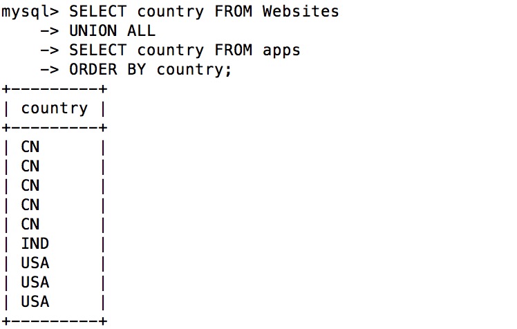 下面的 SQL 语句使用 UNION ALL 从 "Websites" 和 "apps" 表中选取所有的country(也有重复的值):