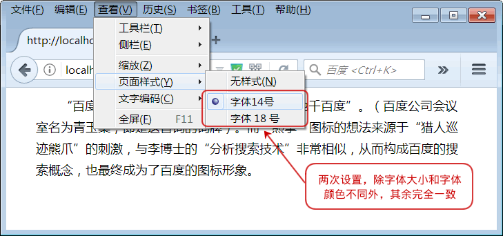 【示例3】分别为火狐浏览器设置两种字体大小样式,通过火狐“查看”菜单进行修改。