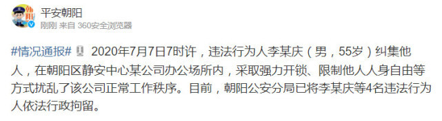 据平安朝阳官方微博消息显示,2020年7月7日7时许,违法行为人李某庆(男,55岁)纠集他人,在朝阳区静安中心某公司办公场所内,采取强力开锁、限制他人人身自由等方式扰乱了该公司正常工作秩序。目前,朝阳公安分局已将李某庆等4名违法行为人依法行政拘留。